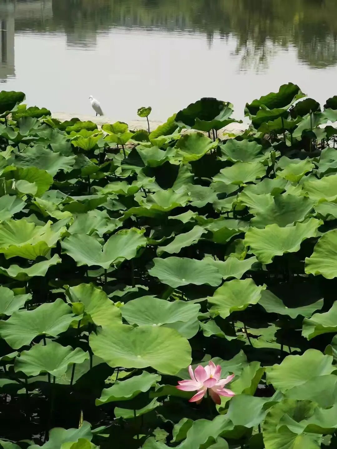 荷塘边绿柳婆娑,鸟叫蝉鸣,黑天鹅和白鹭偶尔也会光顾,吃小虫子,肚子饱了顺便赏花。