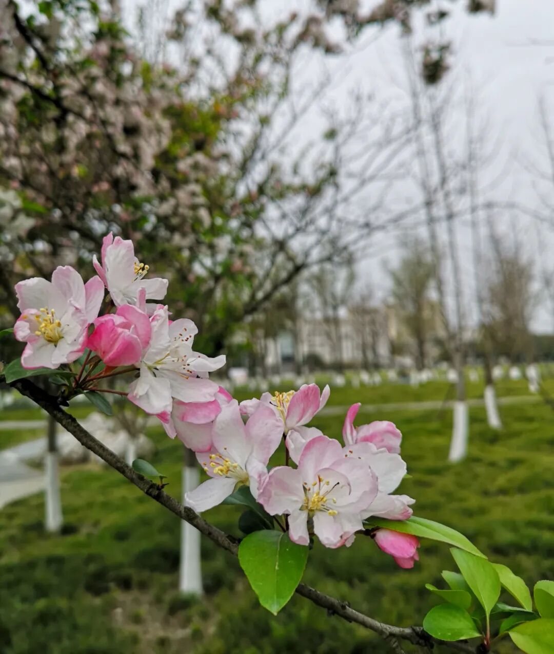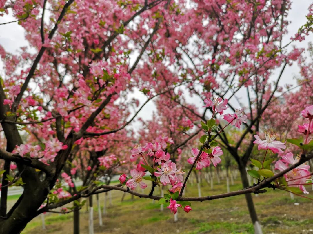 银杏大道另一侧的垂丝海棠,已经成为一片粉色花海。
