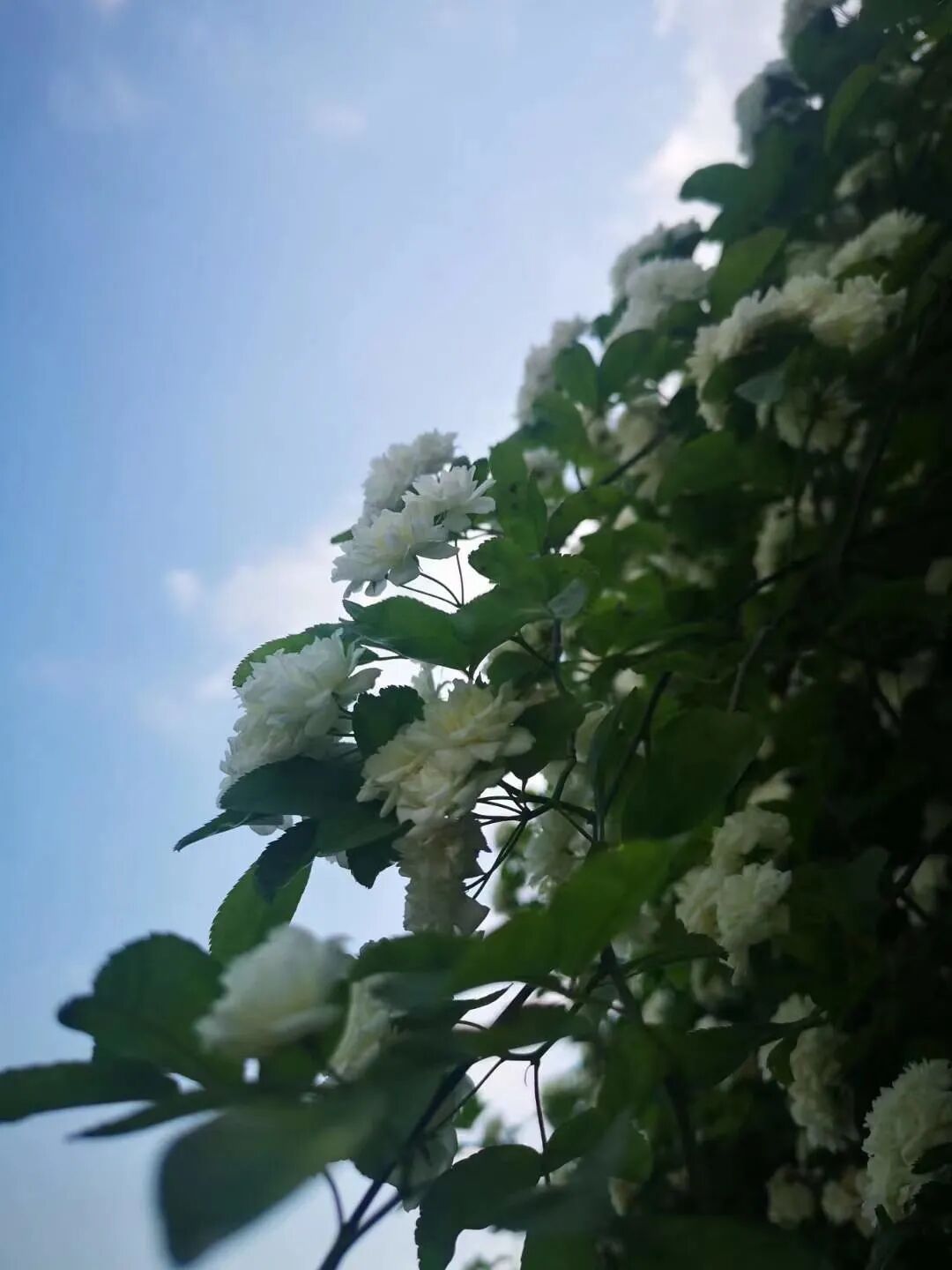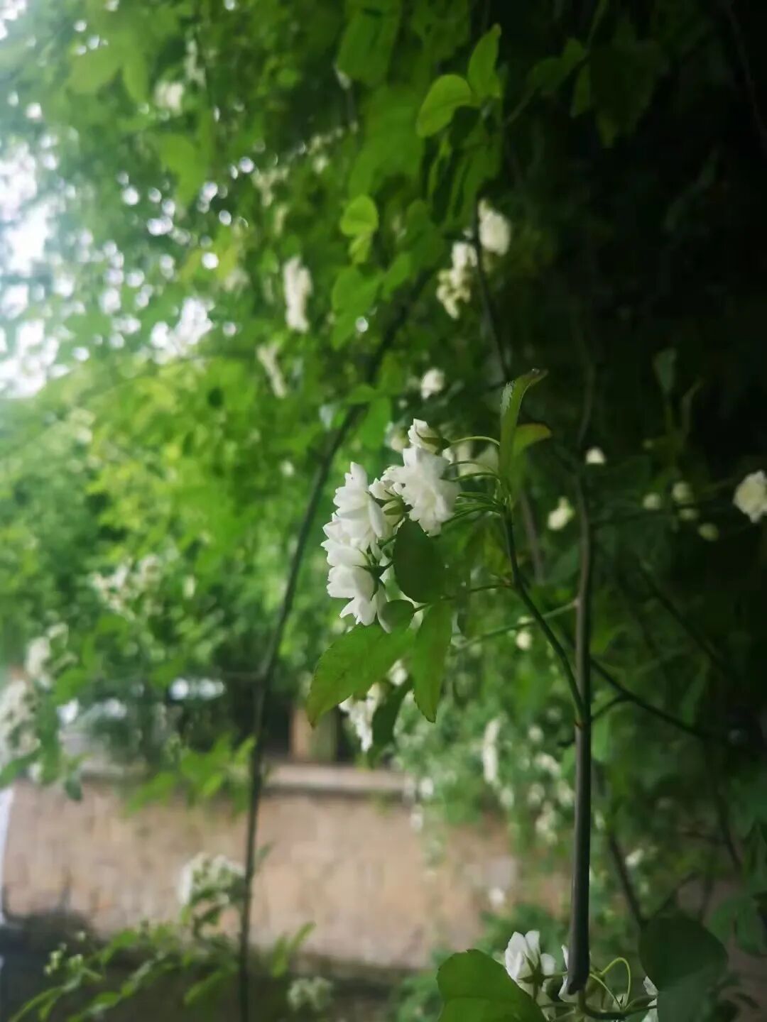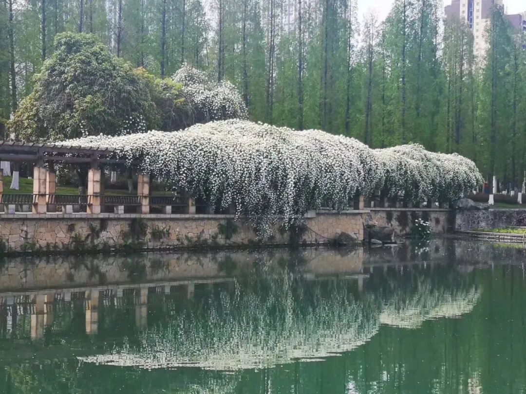 走过木桥,来到长廊,白色木香花盛开着,一朵朵小花点缀在藤蔓和绿叶之间。在木桥上,可以欣赏木香花藤蔓的倒影,而在长廊里面,视线穿过木香花藤蔓,可以看到八角书斋在湖中的倒影。