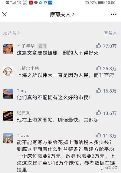 关于上海疫情,网络里出现了两篇雄文,分别是《上海逝者》和《上海人的忍耐已到极限》。后者上海人的忍耐已到极限,更是创造了互联网史上的超级纪录。各类数据都是顶级和第一,2000多万的阅读量还在继续增长,估计会破亿,光第一条留言的点赞就有77万。