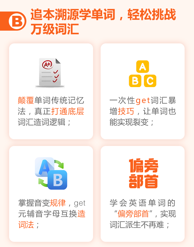 格林法则从字母层面进行拆解,打通词根词缀底层演绎逻辑,就能极大减轻记忆负担,由已知推未知,由熟词推新词,就能“滚雪球”般扩充词汇量。