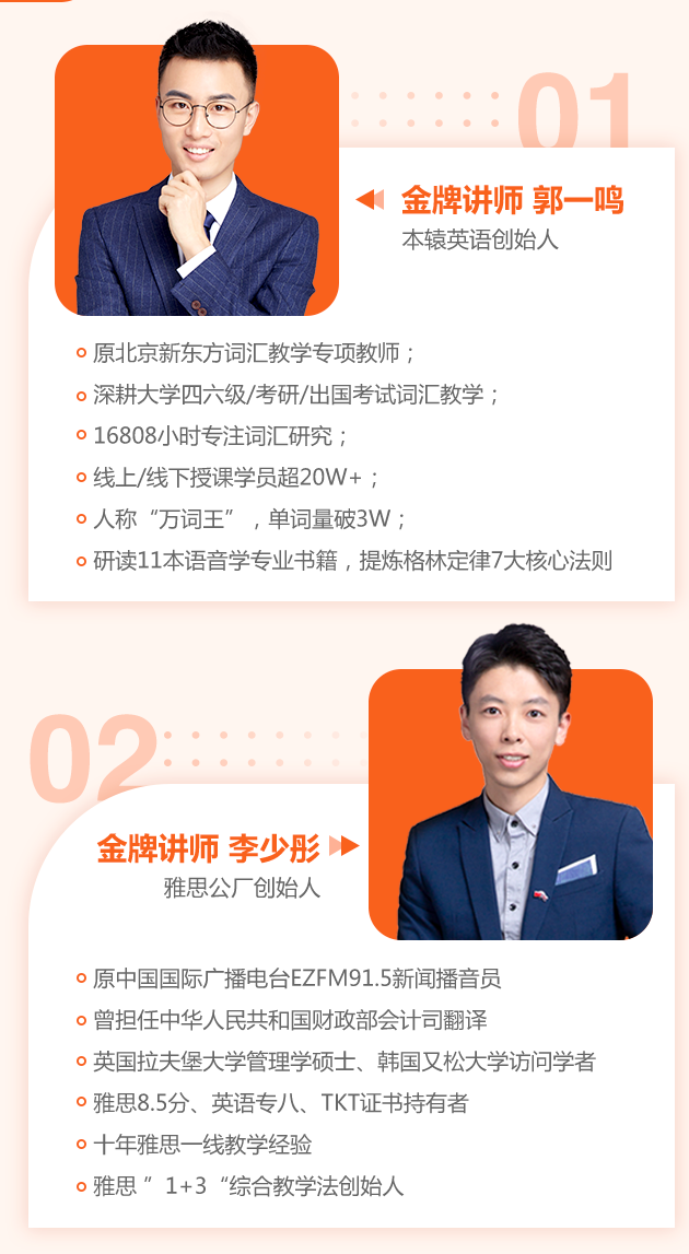 说到这里,我想为你推荐两位靠谱的英语讲师——“万词王”郭一鸣老师、“雅思满分打印机”李少彤老师,为你的单词记忆之路保驾护航。
