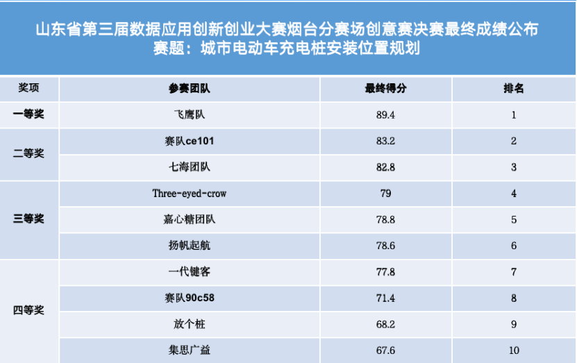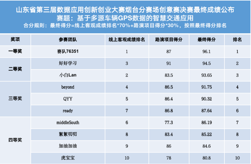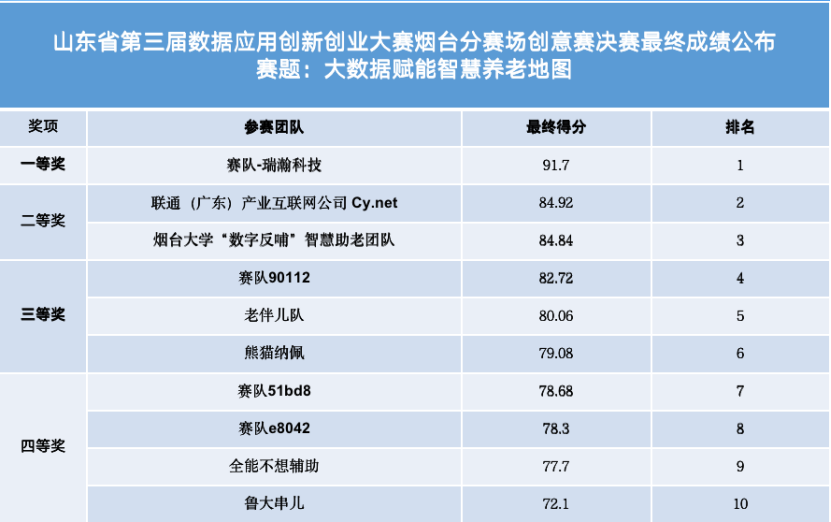 本次大赛“数果累累”,涌现出许多让人眼前一亮的数据创新方案和数据模型。经过专家评委评审,山东数据应用创新创业大赛烟台分赛场决赛成绩排名如下:
