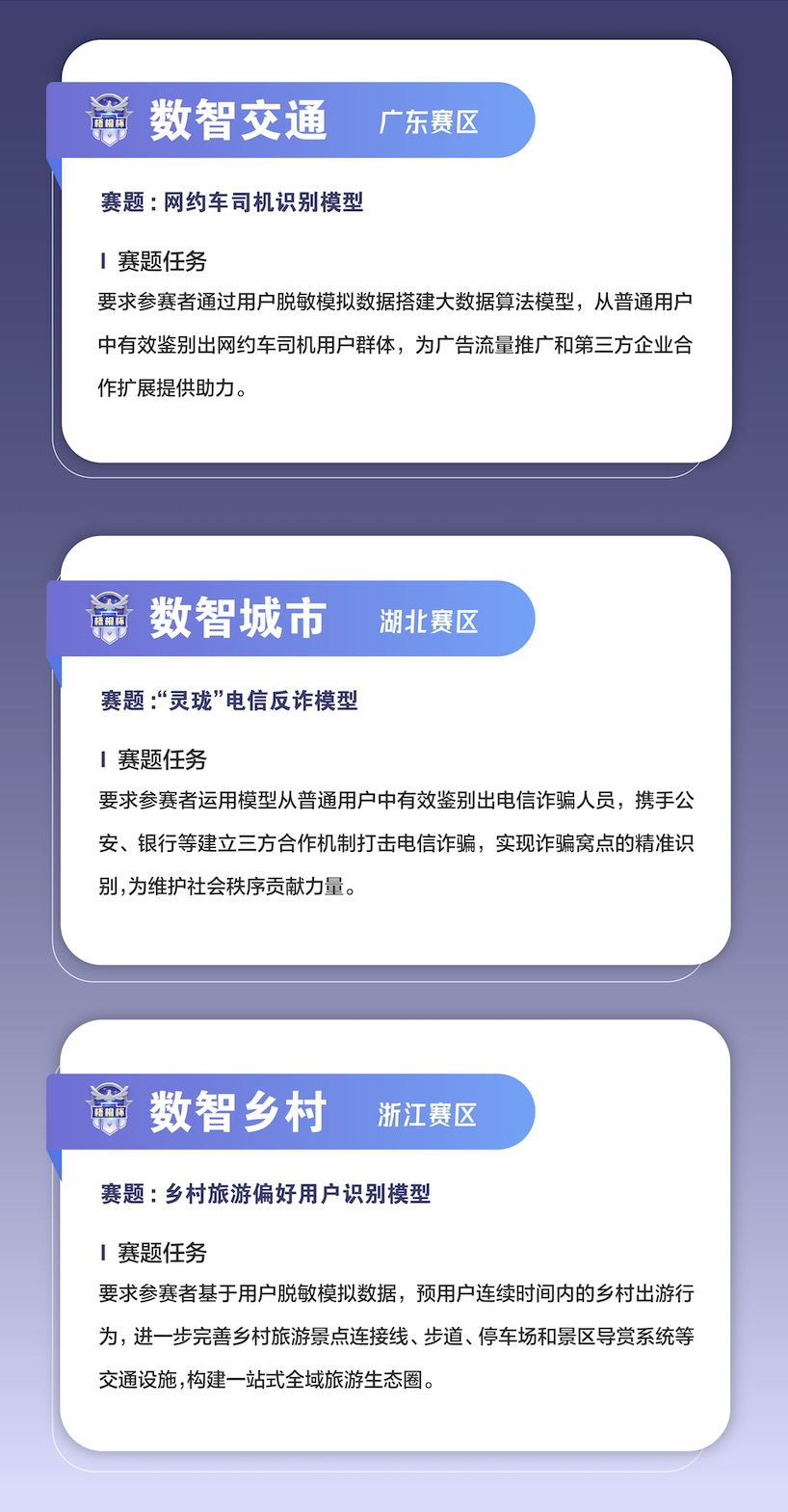 本次大赛已于4月6日正式开始,报名截止日为5月11日。赛事全程为期6个月,包括分区初赛、分区复赛、复活赛、全国总决赛四个阶段,分设数智交通(广东赛区)、数智城市(湖北赛区)、数智乡村(浙江赛区)三大赛区。