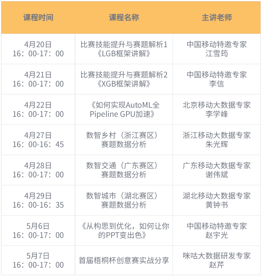 同时,本次大赛特设高能训练营,以参赛需求为导向,设置赛题解析、算法培训、数据分析、答辩指导等多种直播与录播课程,并附设训练赛,为初次参赛的学生提供更加平滑的成长路径。直播课程将于4月20日正式启动,具体安排如下: