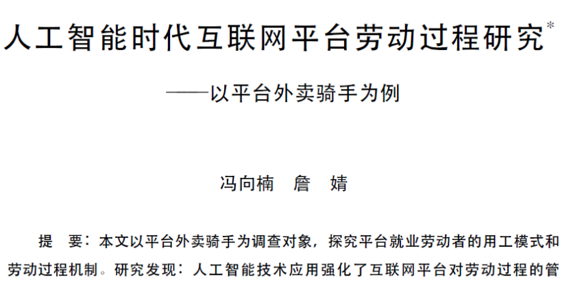 和Zizheng Yu有相同观点的还有首都经济贸易大学的冯向楠,他在《社会发展研究》中的一篇论文中说:骑手正通过合理利用规则、主动的合作与抗争、自主选择餐路线和顺序、搭建 “前后台”、寻找成就感与身份认知等方式减少平台的控制,争取劳动的自主性,维护自身的主体性。