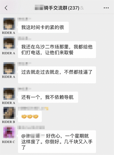 同伴互助在论文中被定义为微弱的反抗,骑手一般以站点为单位,建有自己的微信群。在微信群中,骑手可以交流送餐技巧,如餐品如何摆放、路线如何规划、讨要好评话术等。通过以上内容的交流,骑手之间形成互助,以提高送餐效率和减少差评。