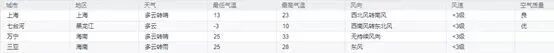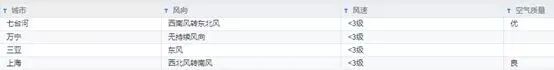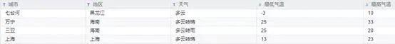 由于选定的数据集较大,我将其中的数据筛选几条出来进行演示,以下是两个关于城市天气预报的表: