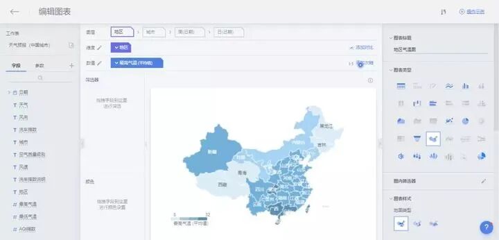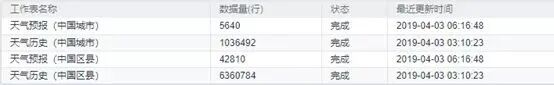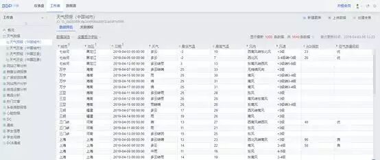 本文的操作案例选择BDP提供的公共数据源:天气数据,由于数据量较大,重点使用第一个工作表“天气预报(中国城市)”的数据。