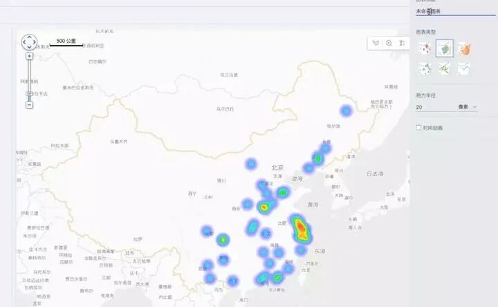 将工作表拖拽到图层,在右侧有6种图表类型可供选择,包括热力图、气泡图、动态轨迹图等。