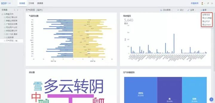 仪表盘导出:可以将做好的数据报表导出来,支持PNG和PDF,可以作为汇报的素材。