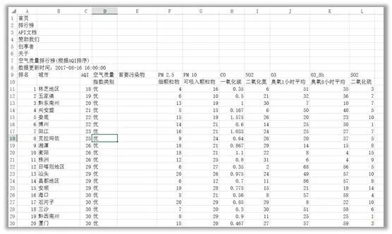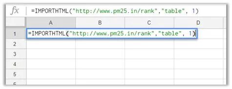 对于我们要爬取的网站,我们在Google sheet的A1单元格中输入函数=IMPORTHTML("pm25.in/rank","table",1),回车后就爬得数据啦~