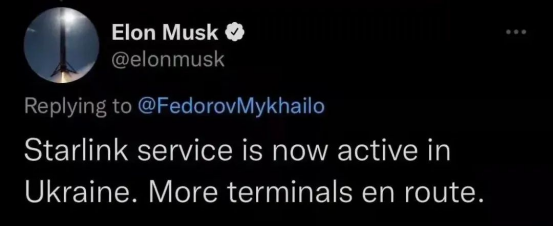 就像马斯克,带着他的星链(Starlink)参战了。