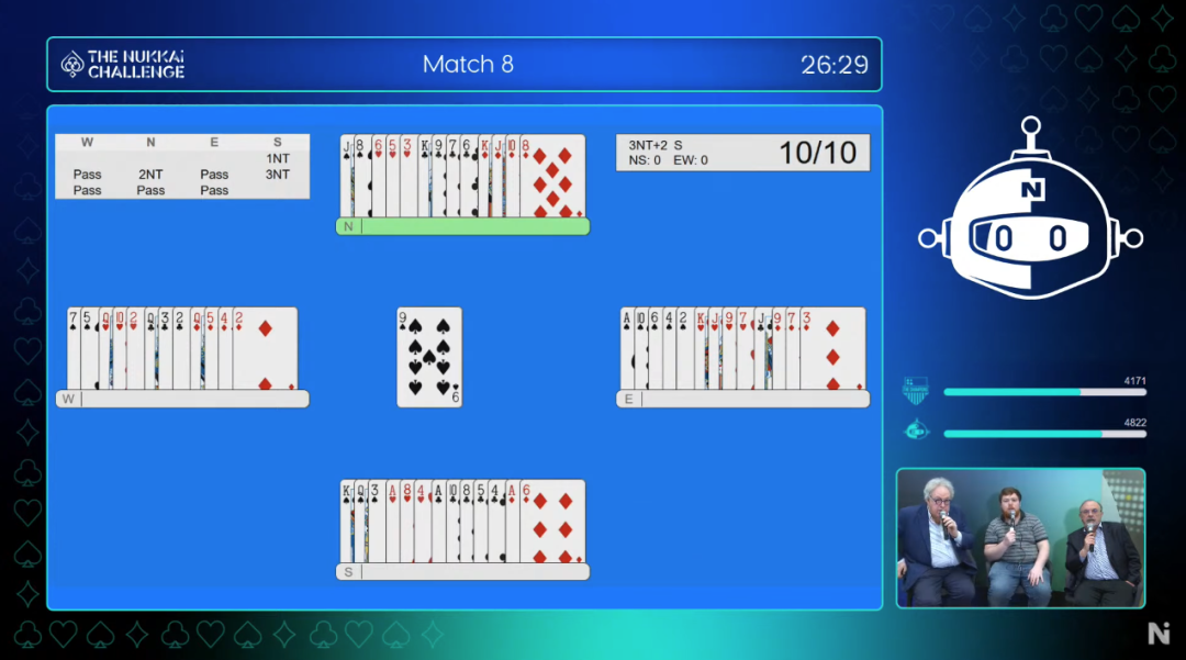 这一次,在一个名为“The NukkAI challenge”的桥牌比赛中,与人类冠军拥有同样的扑克牌和同样的对手的 Nook,在 80 次比赛中有 67 次的表现要好于人类冠军。